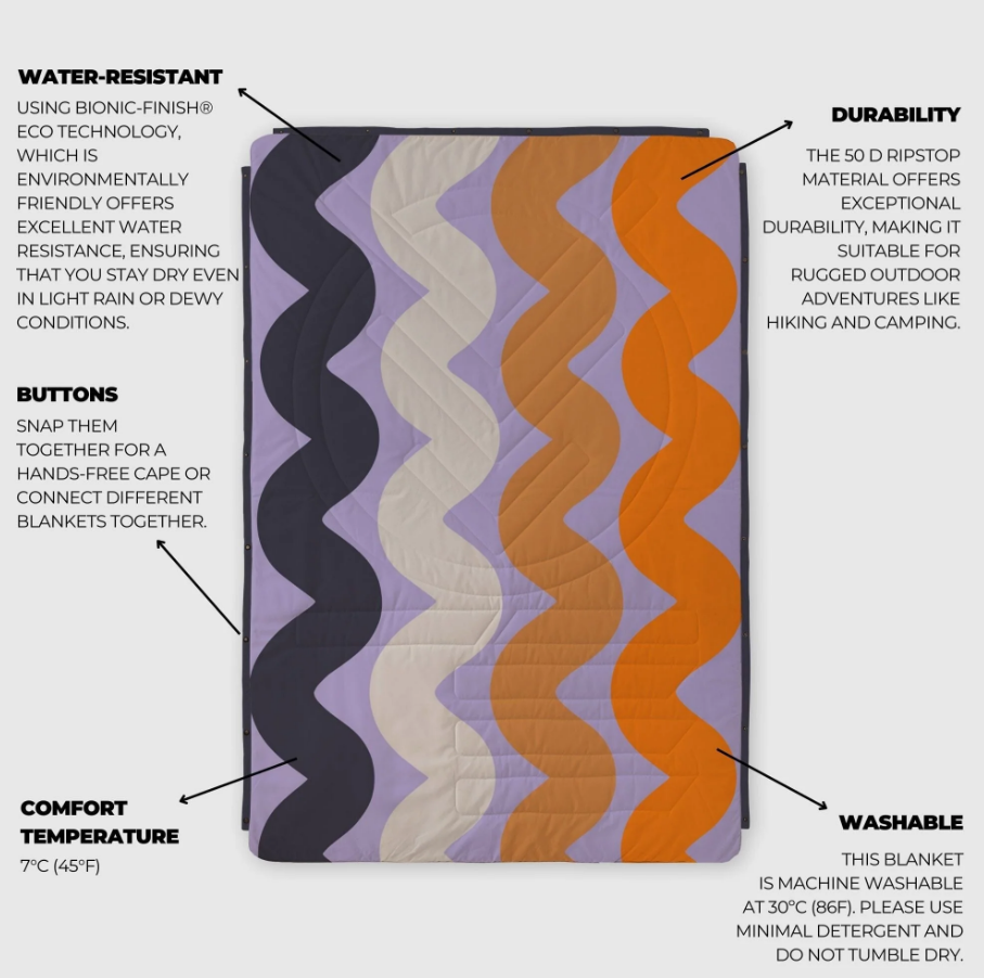 Sustainability meets performance with this eco-friendly blanket, crafted from 100% recycled materials. The high-quality REPREVE® fabric not only helps reduce plastic waste but also provides exceptional resistance to moisture, dirt, and wear—making it an ideal choice for environmentally conscious adventurers.