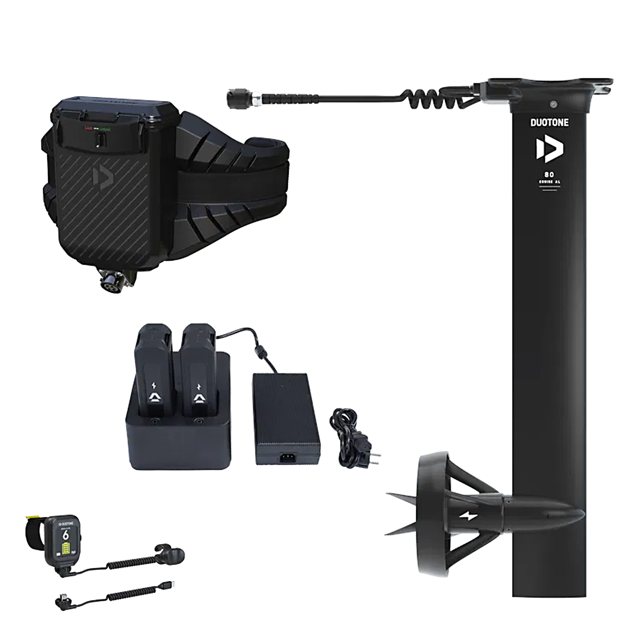 While the assist system may not offer the range or full integration of traditional eFoils, it is significantly smaller and lighter, enabling configurations that dedicated eFoils cannot achieve. Most importantly, you can run this assist setup using your existing boards and foils. To increase the ride time, we recommend purchasing an additional set of batteries.