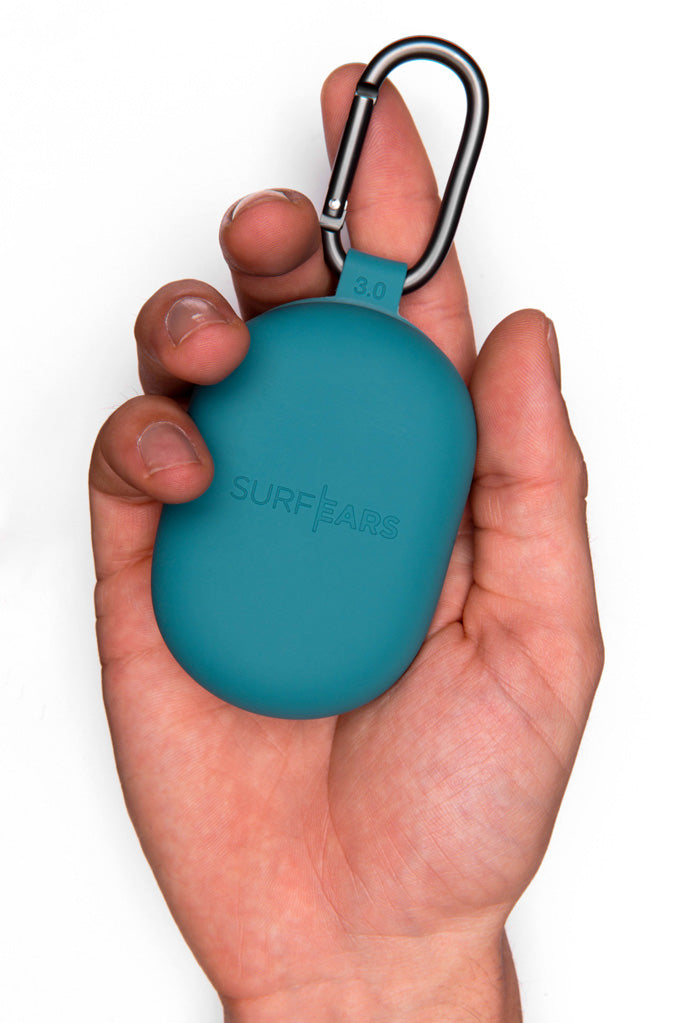 Breathable, silicone case with magnetic closure and Carabiner keeps plugs safe and fresh between surfs