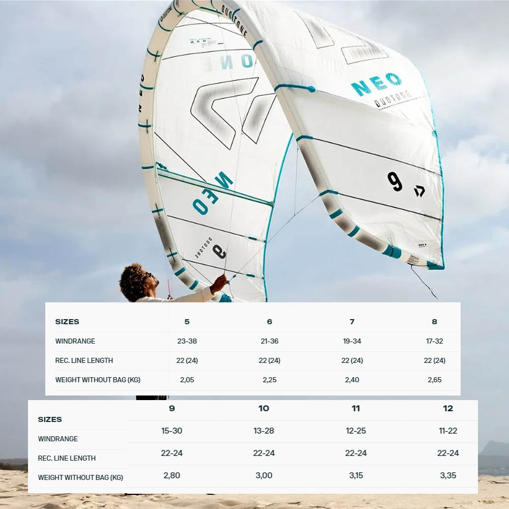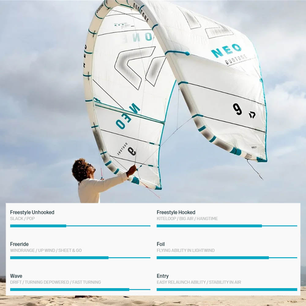 The refinements don't stop there. The Neo Concept Blue’s construction incorporates an increased area of Trinity TX in the wingtip region, effectively reducing weight without compromising durability. This innovation facilitates exceptional drifting capabilities, perfect for riding down the line. Additionally, the kite's overall profile receives an update, featuring a slightly deeper centre profile and a moderately deeper profile towards the tips. These modifications enhance the kite's low-end power and allow for precise wingtip loading, resulting in highly responsive steering. These improvements make the Neo Concept Blue a standout choice for wave-riding enthusiasts, delivering lightning-fast turns and unmatched drift. Its popularity in the wave kite market is well-earned. Versatility remains at the forefront, thanks to multiple settings on the tips that enable you to fine-tune the kite's performance based on the day's conditions. Whether you're embarking on a flatwater strapless freestyle session or conquering the waves, the Neo Concept Blue can be customized for maximum pop and powerful loops or optimized for exceptional drift and rapid turning speed. Another remarkable feature of the Neo Concept Blue is its consistent power delivery across the entire wind range. Abundant low-end power allows you to choose a smaller, more dynamic size, elevating your overall performance. Simultaneously, the Neo Concept Blue offers an extensive upper range with generous depower, allowing you to extend your time on the water even as conditions change.