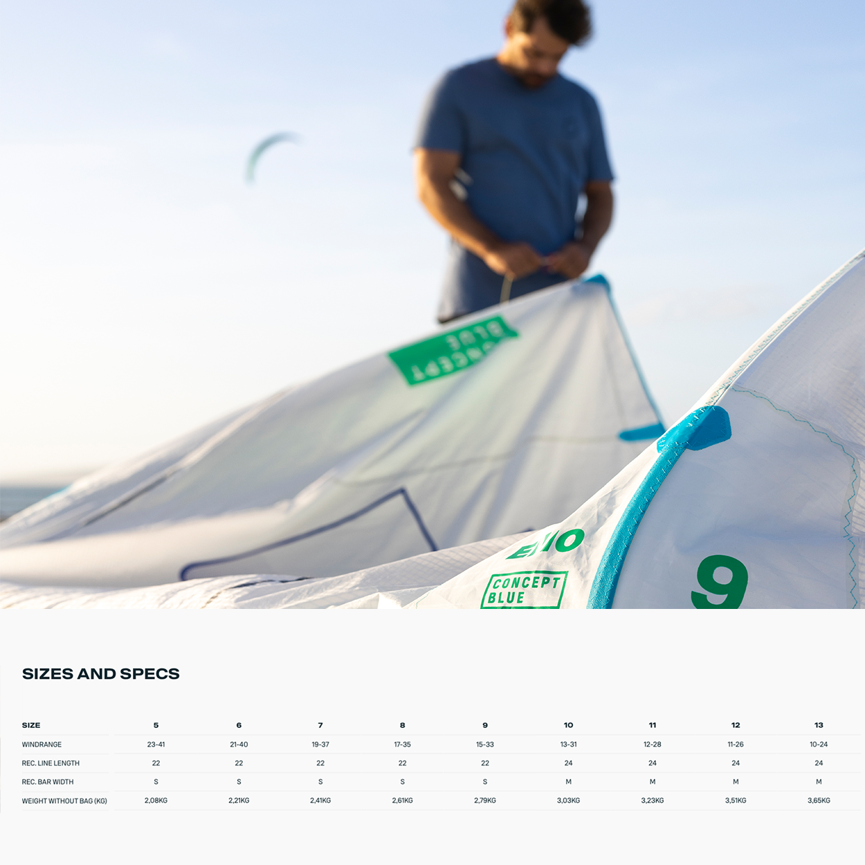The Evo Concept Blue seamlessly merges sustainability with superior kiteboarding capabilities. Ideal for riders of all skill levels, from novices to seasoned pros, this kite is designed with undyed fabrics, recycled plastic components and bio-based bladders, ensuring a minimal environmental footprint. It’s the perfect choice for eco-conscious riders seeking a high-performance, allround kite. This redesigned kite offers a user-friendly experience, making it incredibly intuitive and easy to control. Enhanced jumping capabilities and smooth power delivery ensure that every session on the water is exhilarating. The increased sweep in the design enhances water relaunch and provides superior upwind performance, making the Evo 2025 Concept Blue absolutely reliable in all conditions. Moreover, the Evo Concept Blue also incorporates the new lightweight batten pocket construction. These innovations combined reduce the overall weight and enhance the kite’s durability, promising long-lasting performance while keeping an eye on sustainability.
