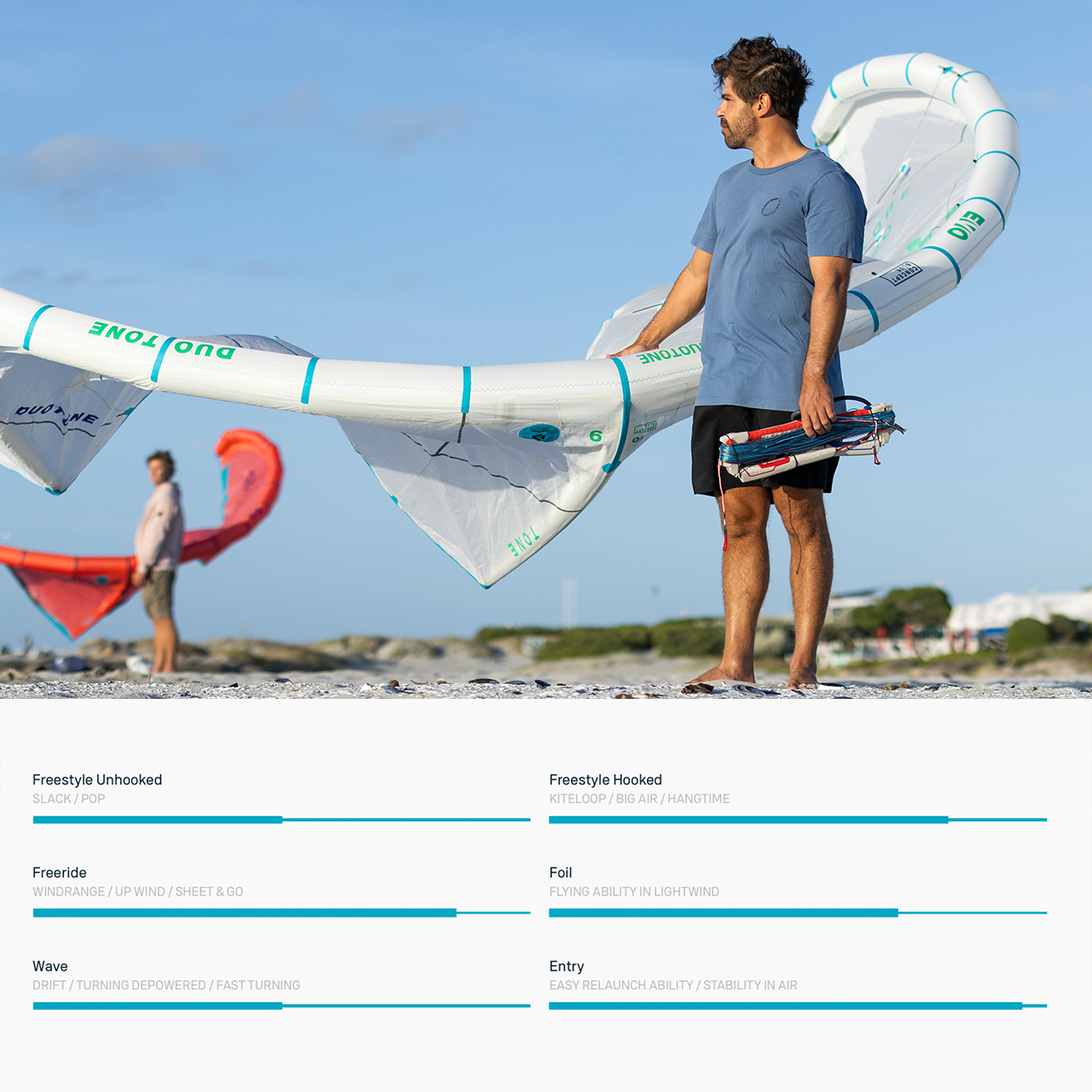 Meet the duotone evo 2025 concept blue, a more eco-friendly variation with unmatched versatility, where environmental consciousness meets exceptional performance. This classic allrounder features the more eco-friendly construction concept blue without sacrificing any of the flexibility and ease-of-use that makes the evo series so beloved by kiteboarders around the globe since years.