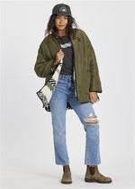 Reversible oversize jacket. Side 1 in quilted ripstop fabric and Side 2 in allover printed sherpa. Front patched pockets on side 1 and welt side pockets on side 2. Woven chest patch identification