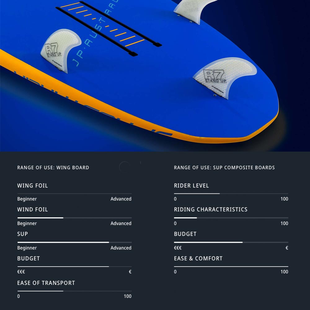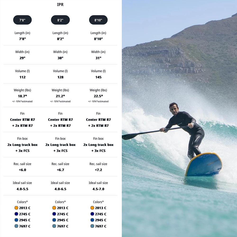Two US long track boxes are available for foil sports, allowing different foil positions based on the rider skills, the size of the foil and the use. On the other hand, the boards are equipped with a set of thruster fins and three FCS boxes for Stand-Up Paddle use.