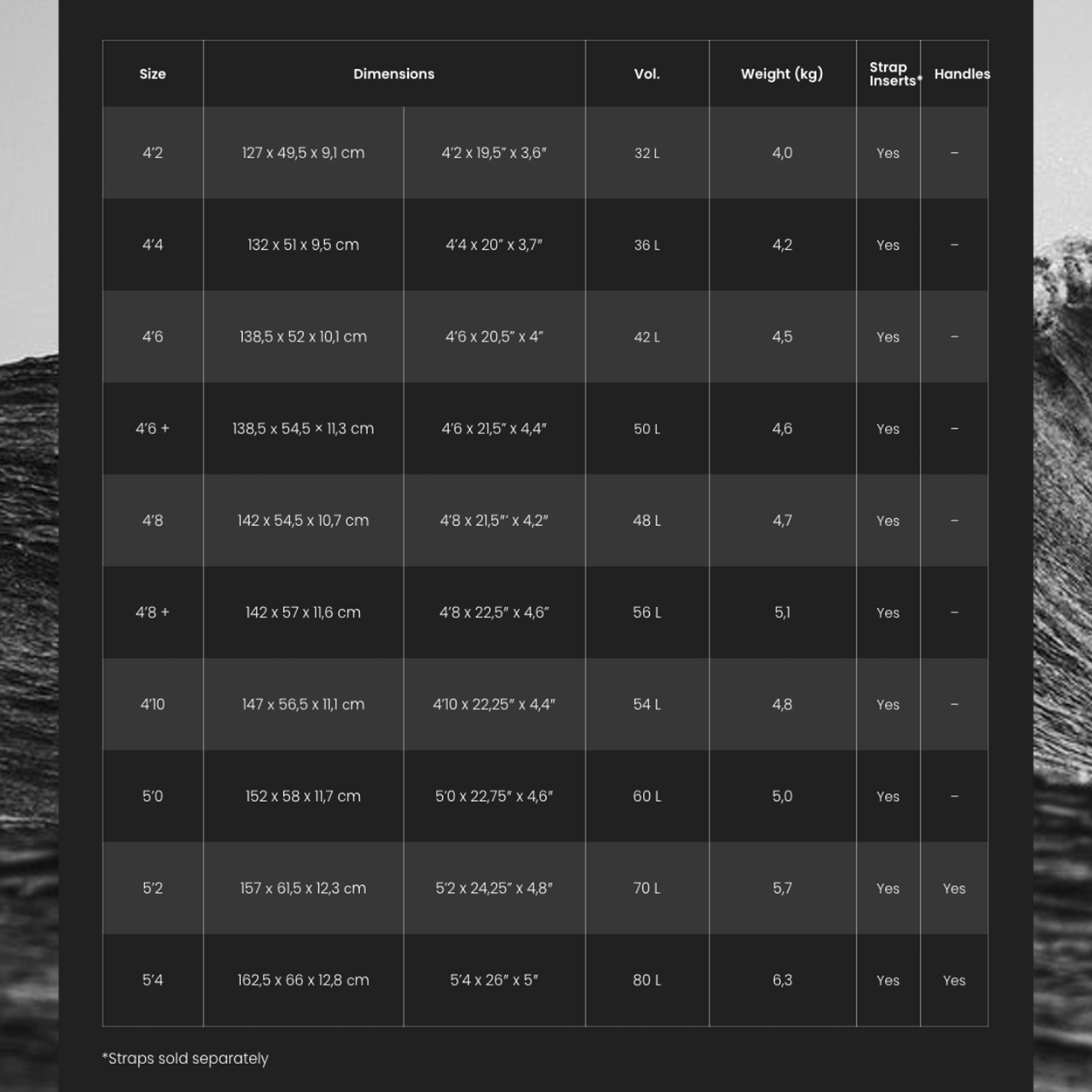 The ROCKET WING-S CARBON range has been expanded, with 10 sizes ranging from 4’2 (33L) to 5’4 (80L). We are also offering new sizes with different length/volume ratios: 4’6+ and 4’8+. These two boards are wider and, above all, thicker to offer an alternative with more volume for the same length for heavier riders.