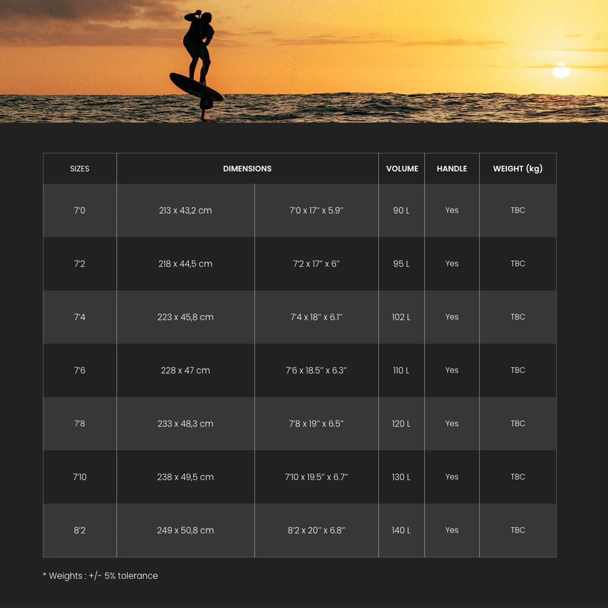 I absolutely love my 65L/4'9" Sky Style SLS Wing Board. I'm about 88kg and it suits me for most conditions. Easy planing, great in waves, sold for jumping. Incredibly light, especially when paired with a DLAB Carve 800 foil and mast, which makes it a great overseas travel option too. Carbon finish and colours look great (picture on website doesn't do it enough justice). Not a big fan of the front foot straps overlapping but going to put the new v-strap on which will sort this.