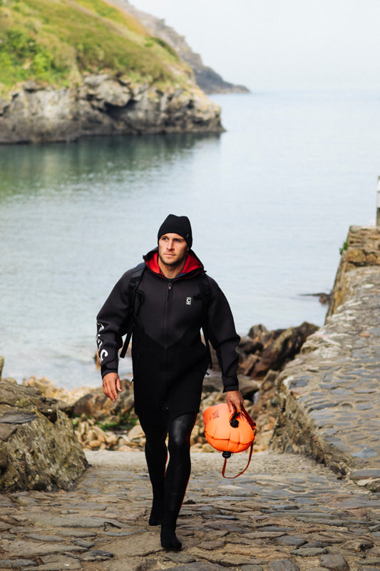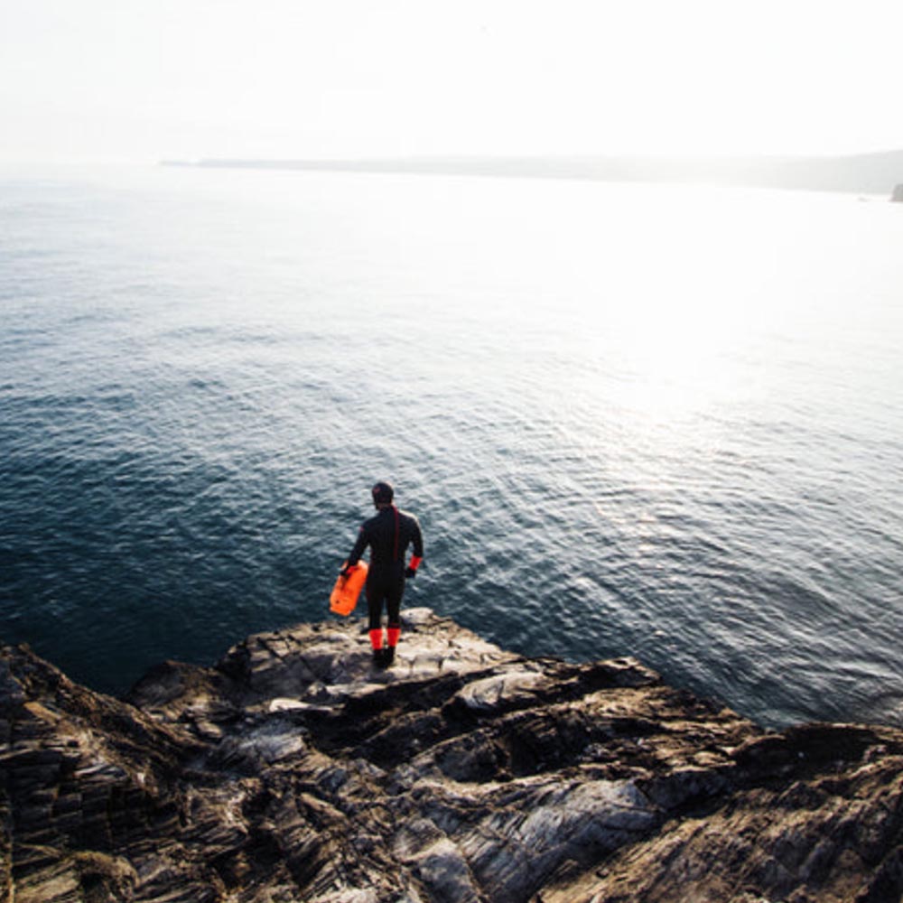 This Hi Vis inflatable dry bag has been designed for storing your kit whilst you swim and to use as an inflatable safety buoy which increases your visibility to others in open water situations.