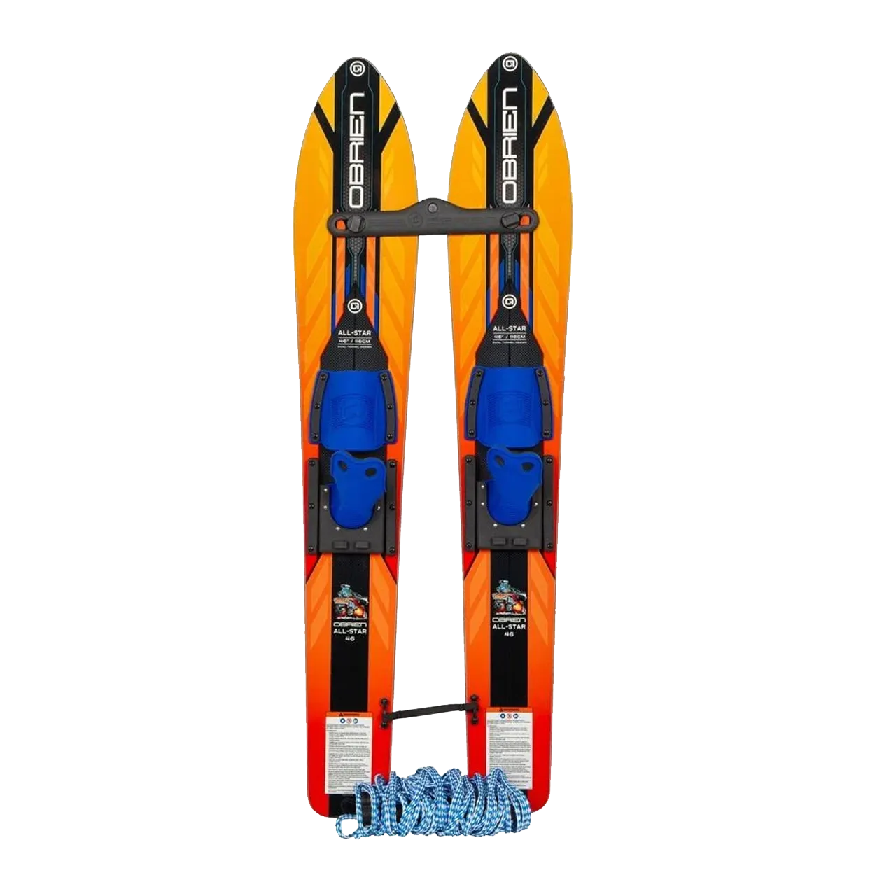 The All-Star Trainers are the ultimate training tool for teaching kids to ski! Featuring a dual tunnel design for a smooth ride, a stabilizer bar that prevents the skis from splitting apart, and the trainer rope and handle, the All-Stars have everything you need to simplify the learning process and turn your kids into waterskiers!