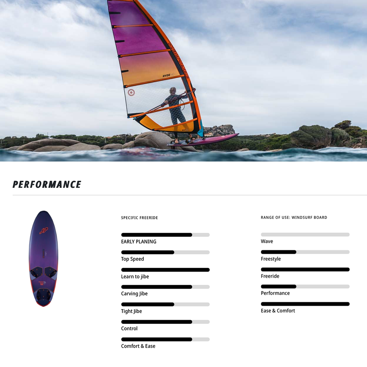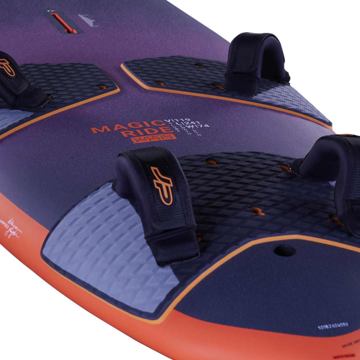 At the same time its rail bite and its reliability when carving steady arcs will encourage the more advanced rider to push harder and corner with full dedication: Tighter and tighter turns, classic freestyle like duck jibes and carving 360s will be the name of the game. The Magic Ride can be quoted a bigger Freestyle Wave and is the most playful and forgiving of JP’s manoeuvre freeride boards.