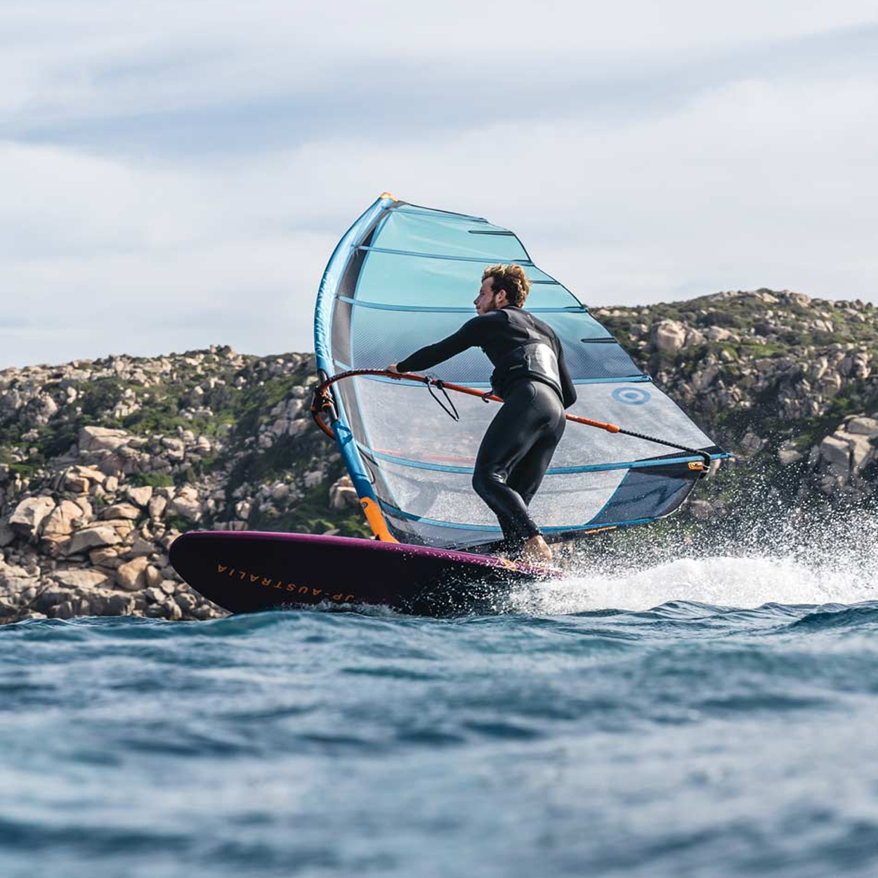 Slightly narrower at the centre and longer -> the stretched-out waterline makes early planing easier and lifts the board effortlessly onto the plane. It provides directional stability at speed and more upwind power.