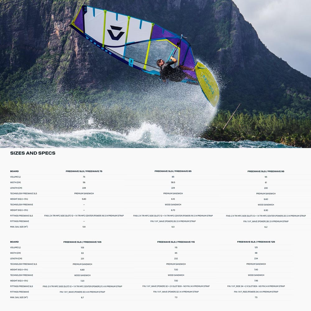 The FreeWave comes in 6 sizes of 75, 85, 95, 105, 115 and 125l for heavier riders and lighter winds