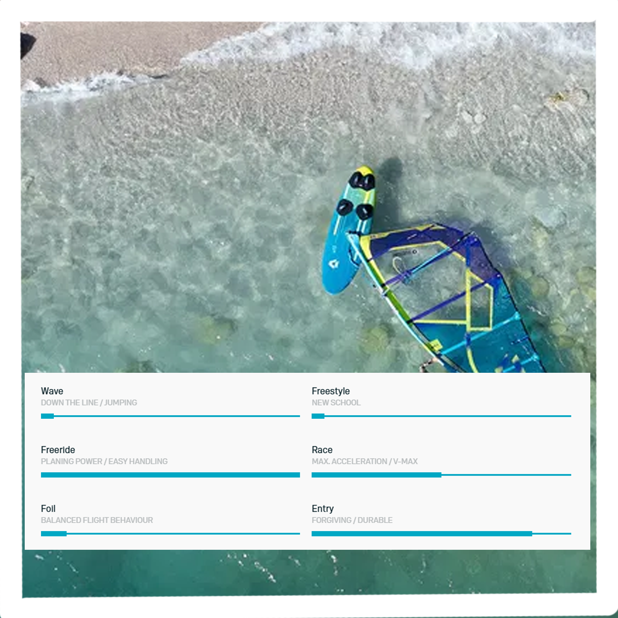The manoeuvre-oriented rail shape allows for an effortlessness and predictable jibing behaviour as the thin rails require less pressure to initiate the turn. This is ideal for jibing novices or to increase your lay-down jibing success rate.