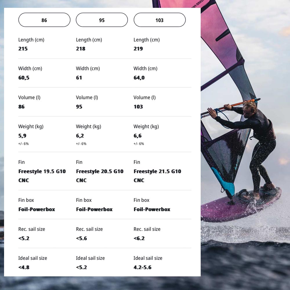 “The Freestyle shapes have just been renewed in 2024 and they are the best boards I've ever had! Now, it was time for the next step: The goal was to make the Freestyles lighter and at the same time as durable and stiff as our current Innegra boards. With the new construction we achieved this goal, because my test board was incredibly light and in five months of intensive sailing, it didn't break. That was a huge success! At first I was sceptical because for me, first priority is to have a strong, durable board and weight only comes second. In most cases, light and durable don't go together, but our shaper and development team proved me wrong. Having a light board under your feet - without having to worry about it breaking - is fantastic. The improved performance will take your freestyle skills to the next level!”