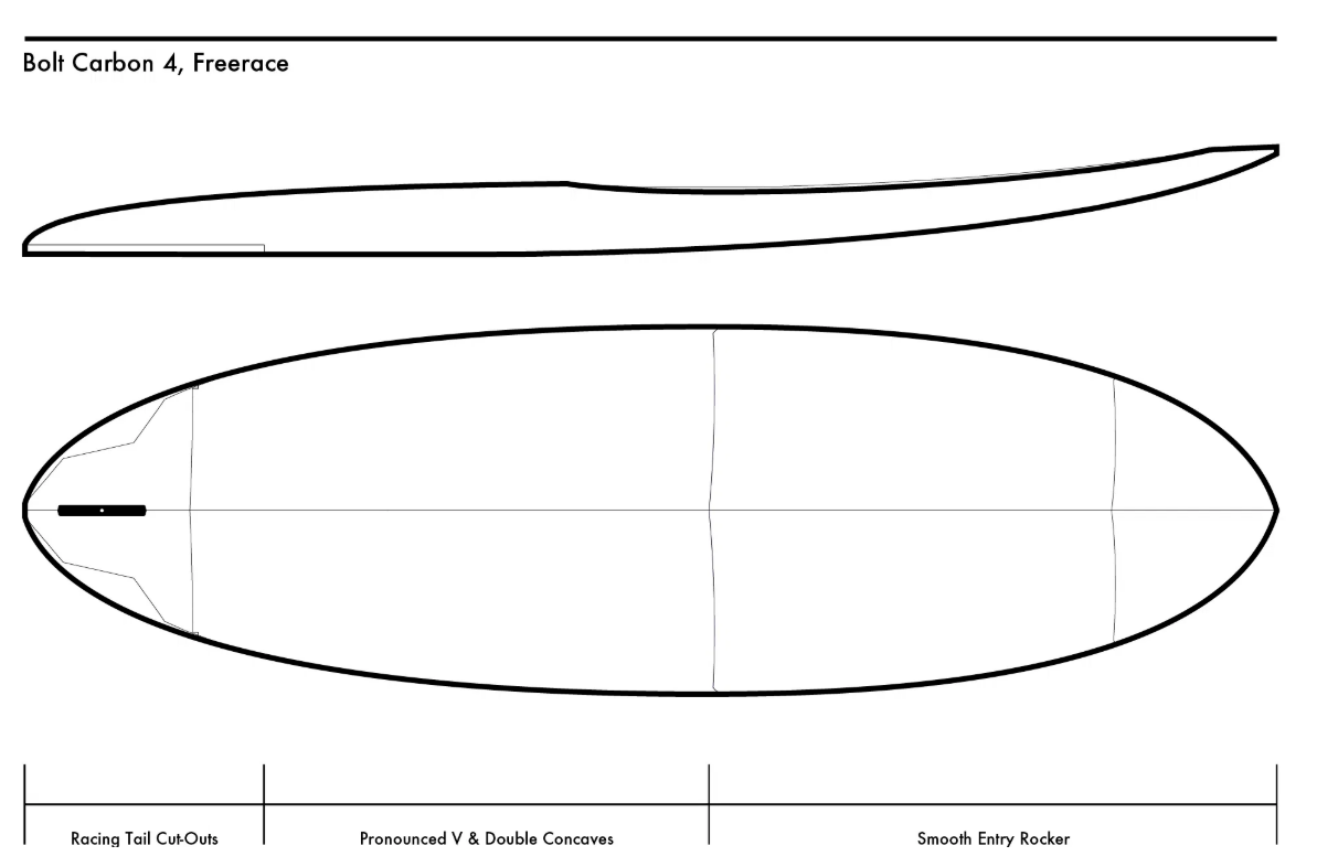 The Bolt 4 Carbon features a new freerace outline designed to deliver high-end pace while keeping the ride composed and accessible. Sharper edges carry through the back for clean release and acceleration, while increased curve toward the front helps smooth out the ride and keep turns rewarding. The result is a board that feels eager to fly, yet stays friendly in real-world conditions — perfect for building speed and confidence session after session.Rocker & bottom curve: instant acceleration with control