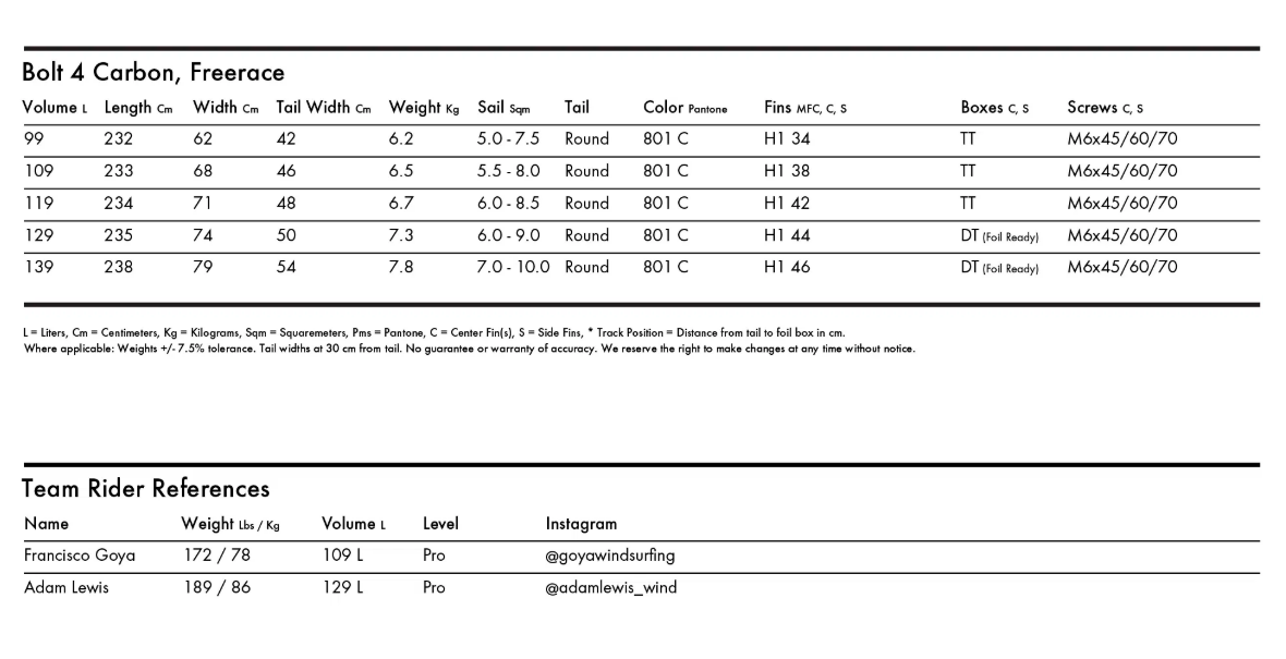The round pin tail enhances ease of use and makes the board more cooperative in jibes and maneuvers, while the integrated cut-outs keep the board releasing cleanly for rapid acceleration. This carefully tuned mix of sharper rear edges and softer forward curves is what makes the Bolt 4 Carbon so addictive: impressive speed, paired with rewarding jibes and a lively, confidence-inspiring feel.If you want a carbon freerace windsurfing board that’s built to go fast, plane early, stay controlled, and still carve a satisfying jibe, the Goya Bolt 4 Carbon is ready to deliver.The Goya Bolt 4 Carbon Windsurf Board