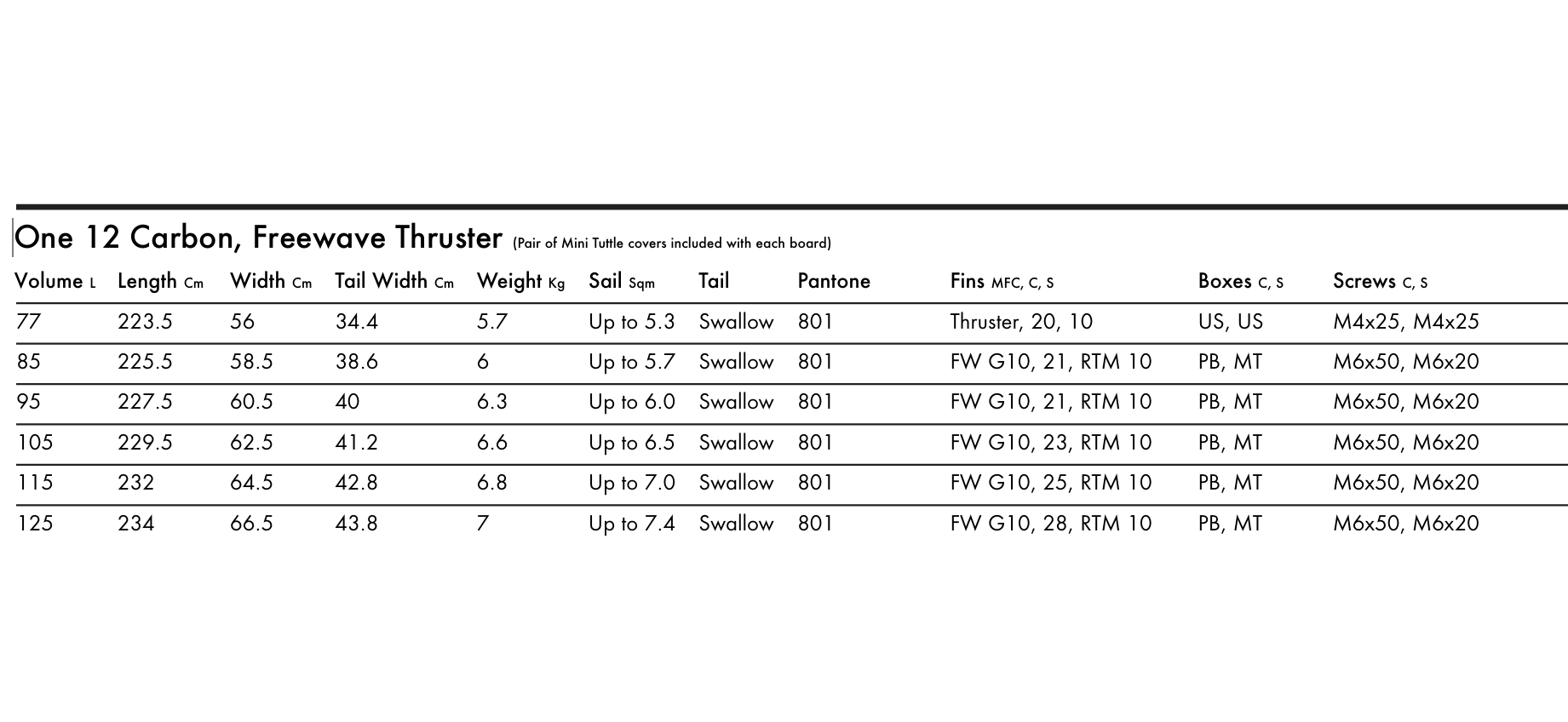 The One 12 Pro Carbon is available in 77, 85, 95, 105, 115, and 125 litres, giving you a size for everything from powered freewave sailing to all-round freeride conditions. The thruster setup provides extra grip and control when it’s choppy, while still offering plenty of release and drive for fast, confident planing.