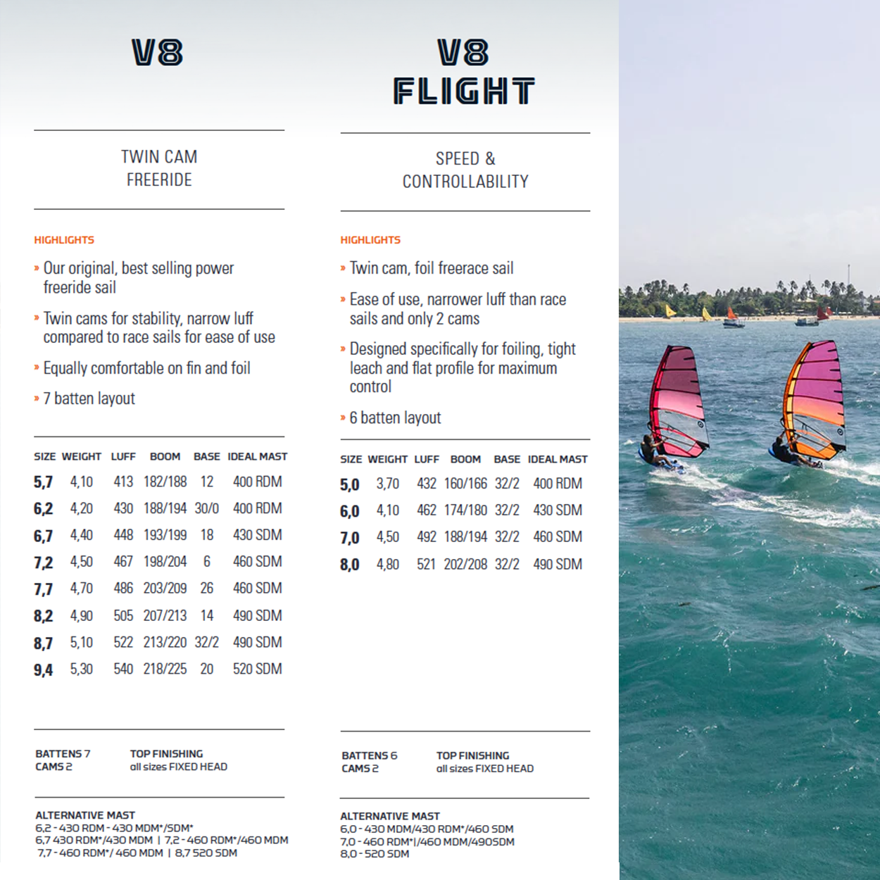 2 cams and a narrower luff sleeve make the V8 easier to rig, jibe and waterstart than a pure race sail. Don’t let the ease-of-use fool you though, V8 can hold its own around a racecourse and boasts even better early planning than even the most advanced slalom sails.