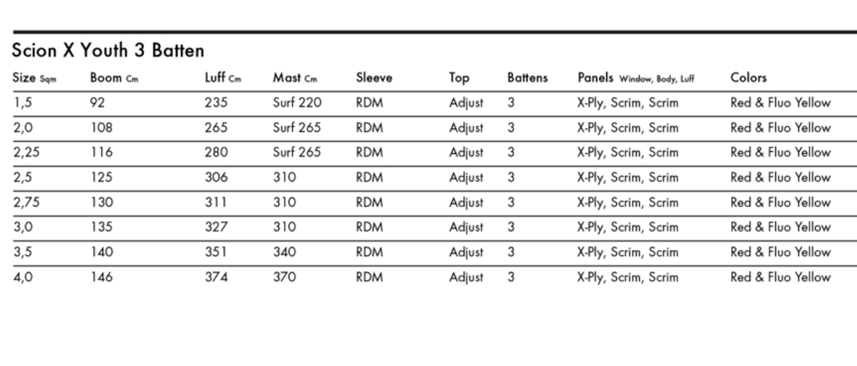 Scion X Youth Windsurf Sail Available in 1,5, 2,0, 2,25, 2,5, 2,75, 3,0, 3,5, 4,0 square meters.