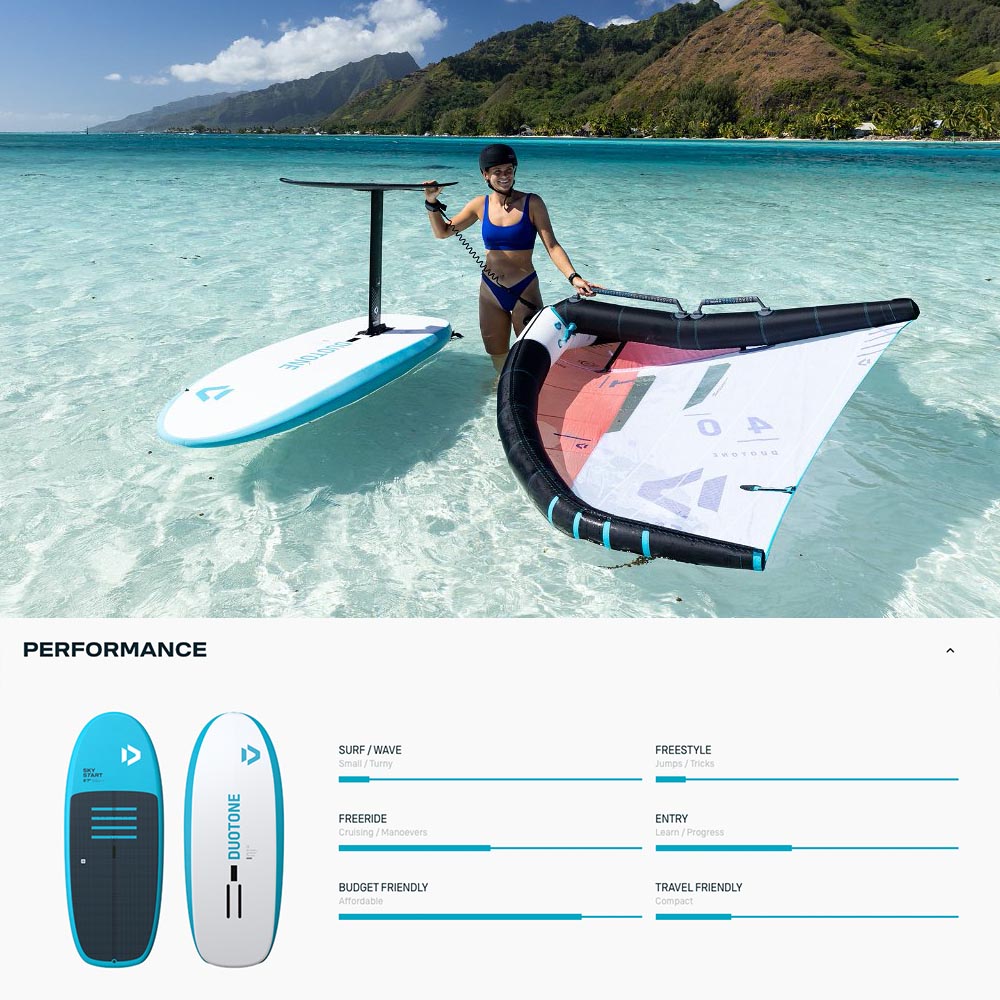 Learn Wing Foiling in no time with the Sky Start – the easiest possible entry into the exciting world of flying above the water! Packaged with the Duotone Float wing - Perfect for your first steps and everything there after. Combined with the Duotone Aero Free SLS foil package, you'll be flying in no time.