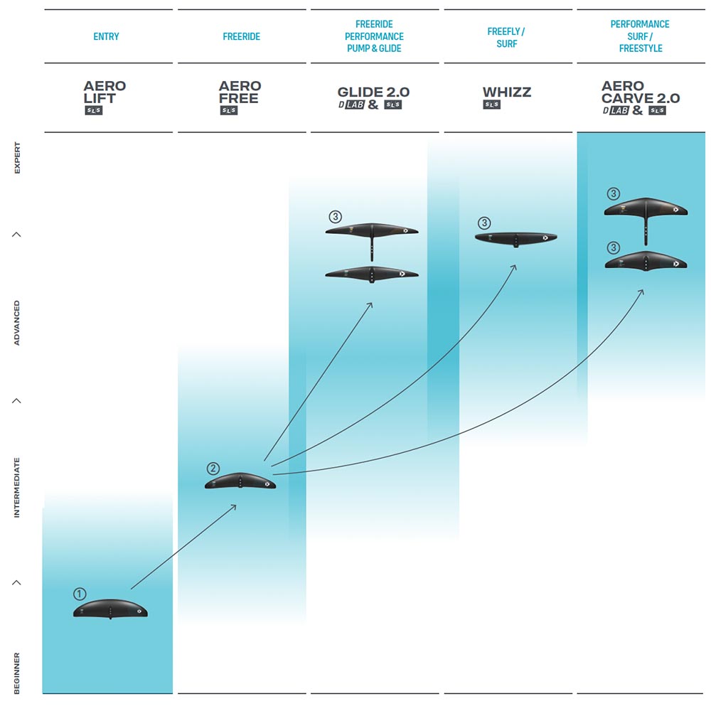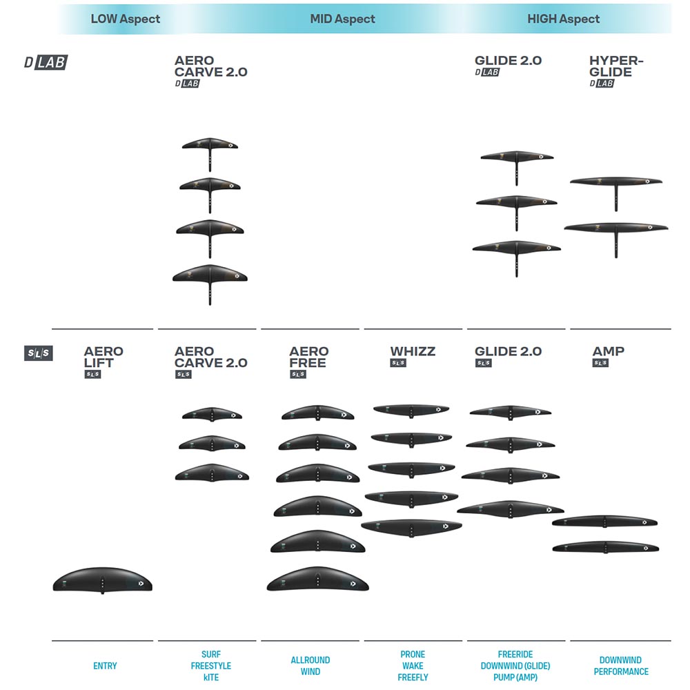 The Carve 2.0 D/LAB range is based on our new Carve 2.0 SLS range but with a few little tweaks. Compared to the SLS range, the aspect ratio is slightly lower and the profile a bit thinner and faster, to allow these wings to be pushed to higher speeds, whether it is going down fast waves, throwing the most technical Freestyle tricks or even using them for Wing Foil or Kite Foil racing.