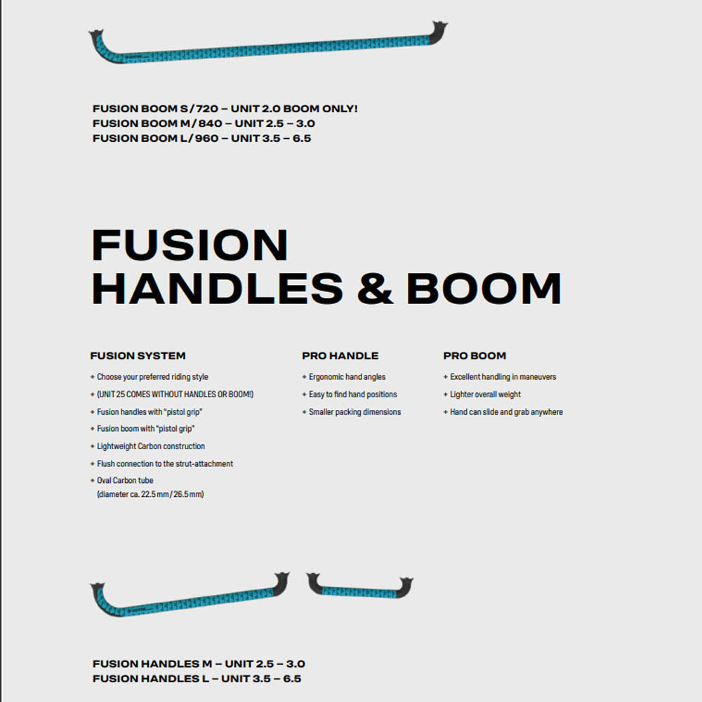 Choose your preferred riding style with the Fusion handles and the Fusion boom, featuring a sleek “pistol grip” design. The lightweight carbon construction, oval tube, and flush connection to the strut-attachment ensure easy to find hand positions and excellent handling in manoeuvres.
