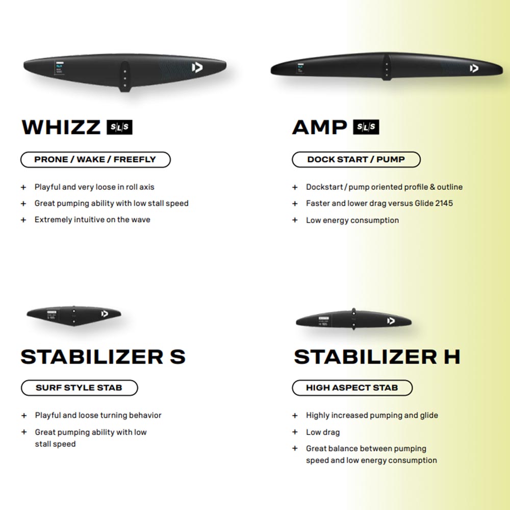 Along with the new Whizz SLS front wings we’ve developed a new range of stabilizers to best match the character of the Whizz. The outline of the Stabilizer S, with very little sweep and a slight dihedral angle gives these back wings a really fun and loose feel. The profile used is completely different to our P or C stabs and really helps in making the whole setup much better at pumping while maintaining maximum playfulness.