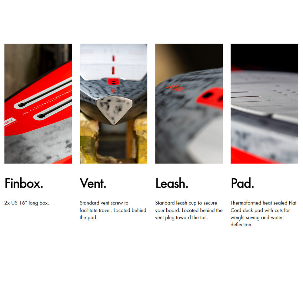 Leash. Standard leash cup to secure your board. Located behind the vent plug toward the tail Pad. Thermoformed heat sealed Flat Cord deck pad with cuts for weight saving and water deflection.