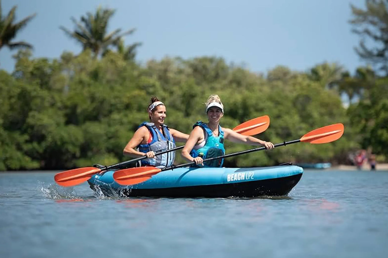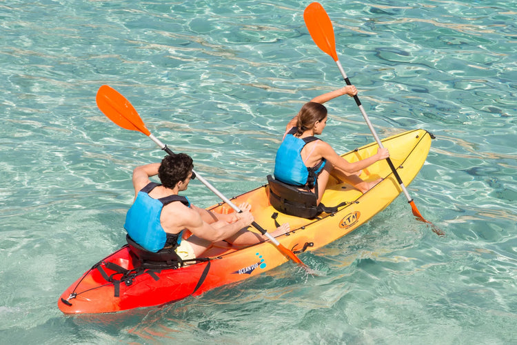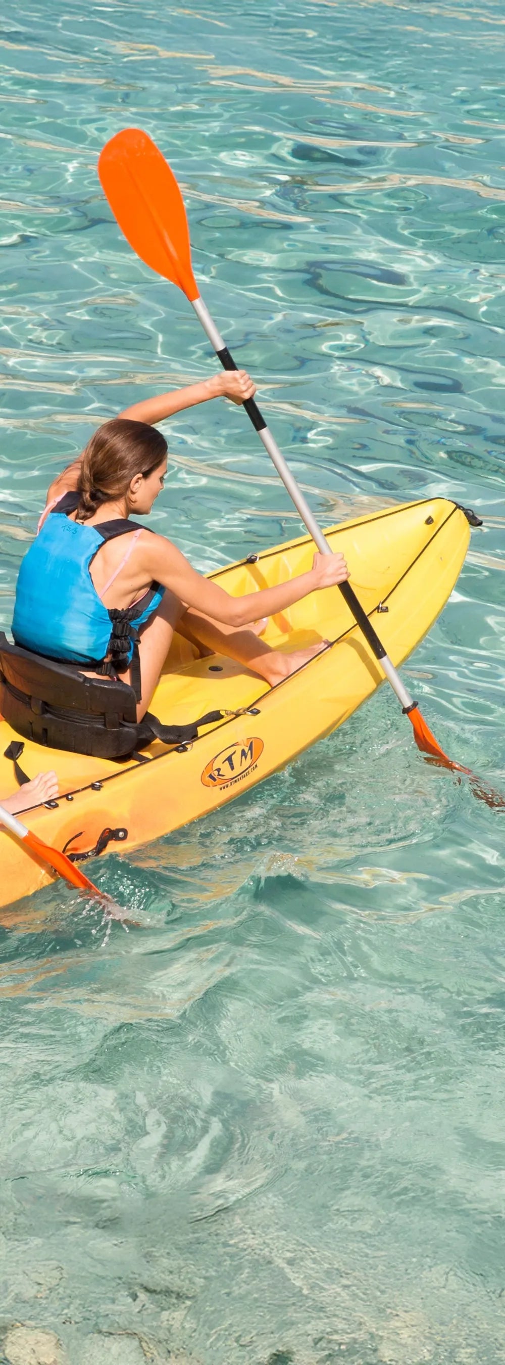 Kayaking is a water sport where you paddle a small, narrow boat called a kayak using a double-bladed paddle. You sit inside the kayak and propel yourself through the water by alternating strokes of the paddle. Kayaks