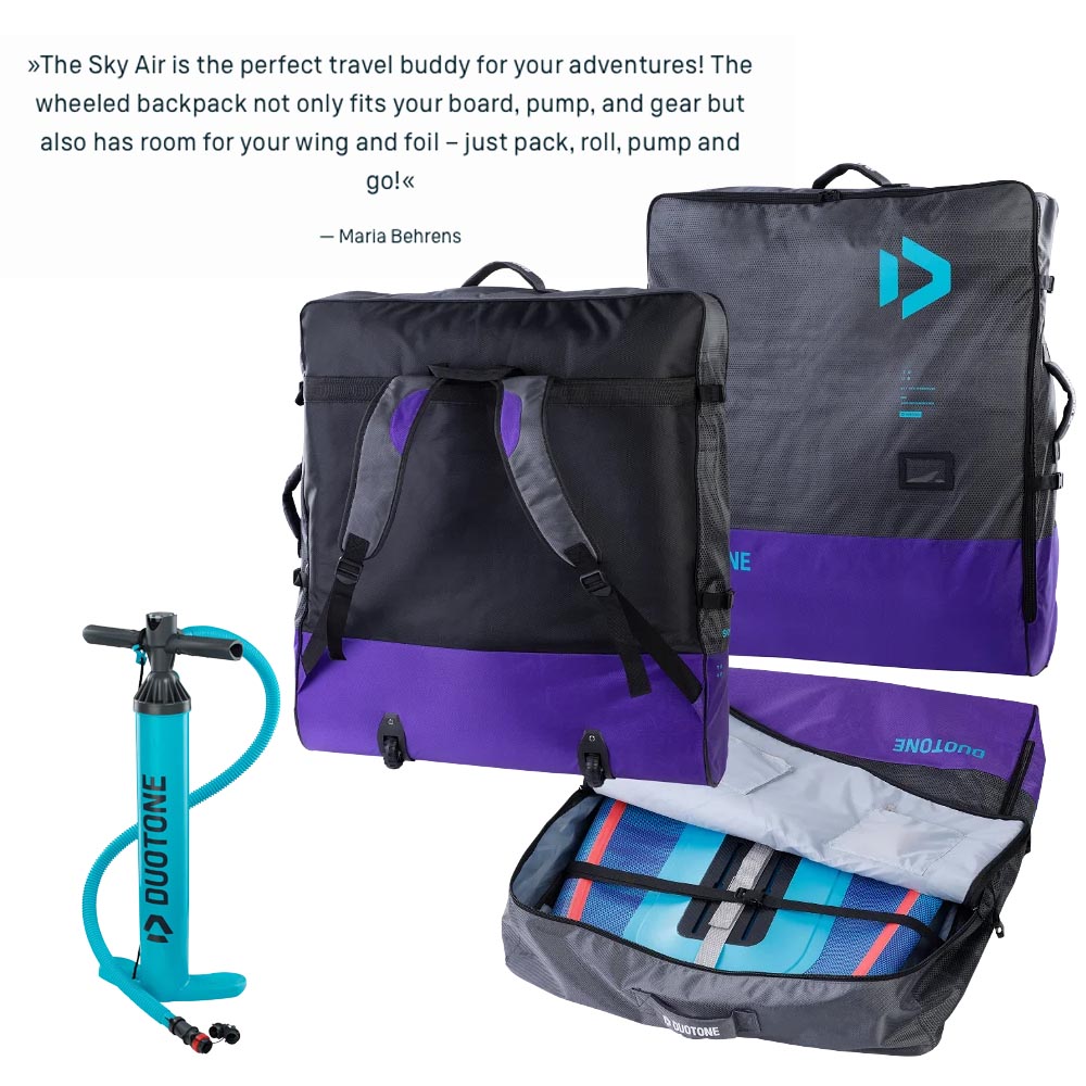 The Sky Air comes in a wheeled backpack that accommodates the board, pump, and all accessories. Additionally, it provides ample space for your wing and foil, making it the ultimate travel companion.