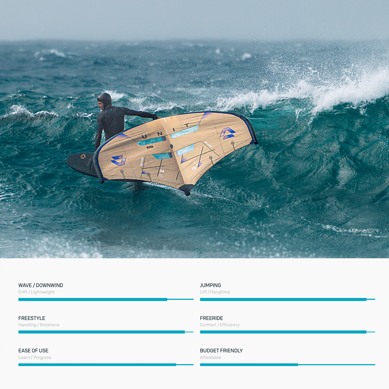 Both wings provide outstanding agility and responsiveness, making them the perfect choice for riders of all levels. The 2026 Unit SLS features enhanced balance across all wind angles and speeds, greater power generation with a direct and intuitive on/off feel, and improved drift stability and steering on the wave for better maneuverability.