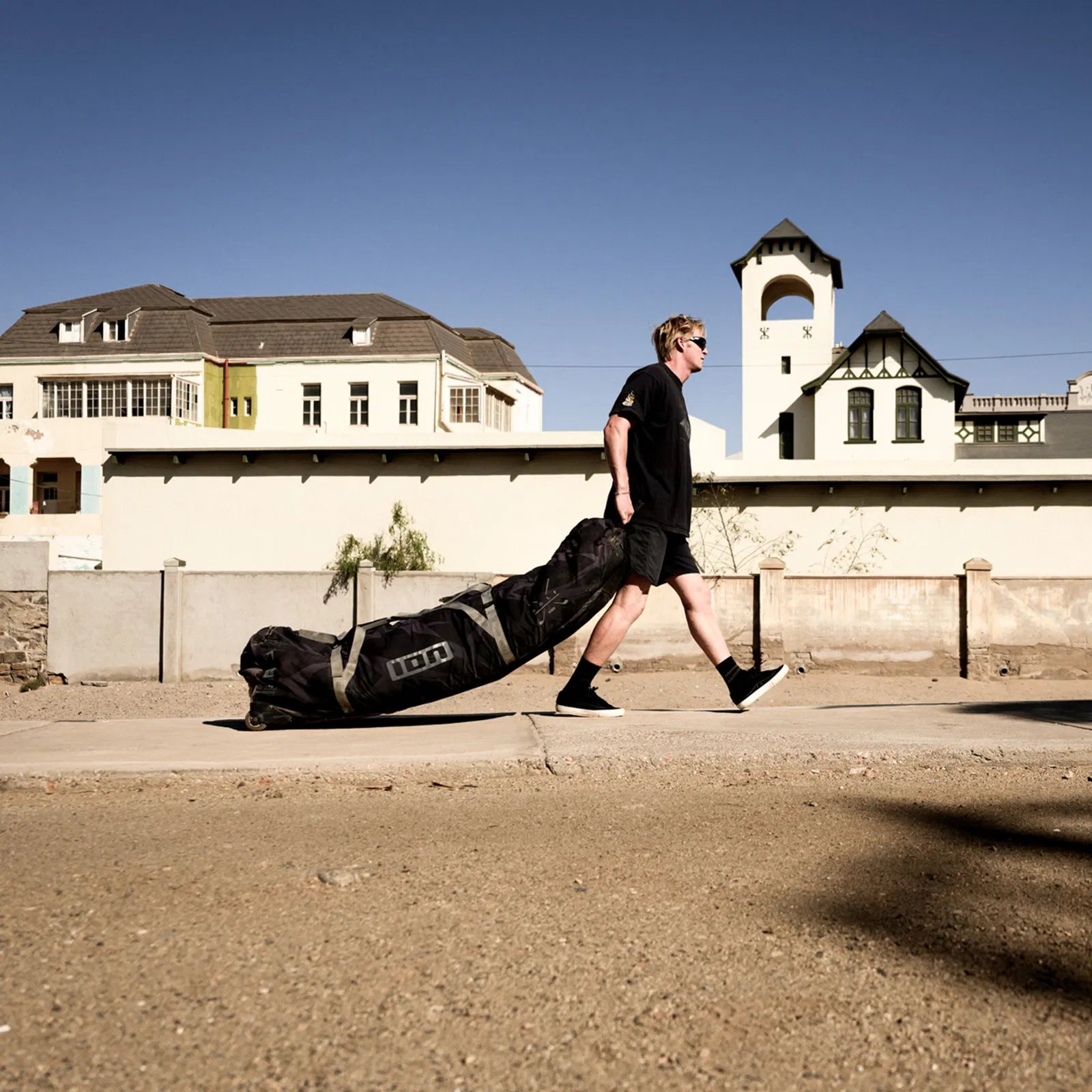 Are you looking for the most comfortable way to travel? ION's Gearbag Tec Golf offers space for your kite gear with a compact design. The outer fabric withstands the wear & tear of traveling and contains 100% recycled PET waste. Heavy-duty wheels let you cruise through airports and sandy sidewalks alike. With ION’s Connective_Handle, you can connect the Gearbag TEC to your personal or airport trolley. The Sherpa_Belt ensures that you always have one hand free for the important things. A molded Curv plate on the bottom adds stability and protection, while Bag_Breeze 2.0 prevents smelly surprises at your destination. Space for min. 1 twintip and 3 kites (max. board size 145*45cm).