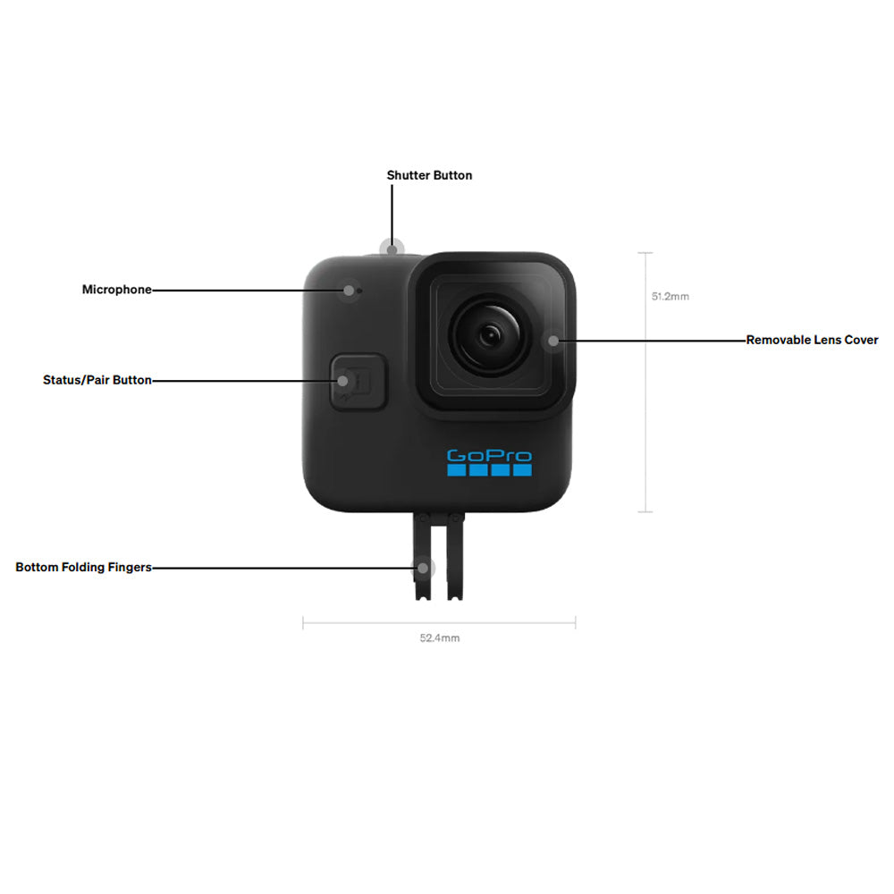 - Includes HERO11 Black Mini camera, carrying case, curved adhesive mount, short mounting buckle + short thumb screw, USB-C cable